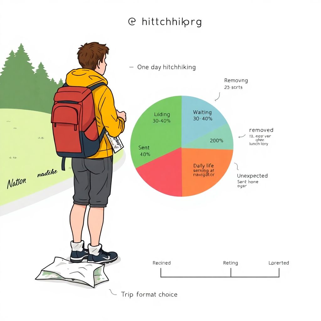 Представь текстовую диаграмму: в центре круг «День на трассе», от него расходятся четыре стрелки — «Ожидание», «Поездка», «Быт», «Непредвиденное». Ожидание — 30–40 % времени: стоишь со знаком, смотришь потоки, корректируешь спот. Поездка — ещё 30–50 %: общение с водителем, навигация, поиск следующей точки высадки. Быт — еда, вода, поиск ночлега, примерно 20 %. Непредвиденное — 5–10 %: ремонт машины, дождь, закрытая развязка. За три года общения с другими путешественниками по автостопу эта диаграмма почти не меняется: цифры гуляют, но пропорции остаются удивительно стабильными.