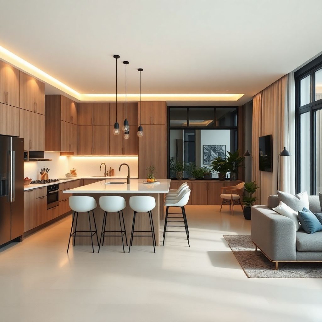 2. Зонирование света — разные сценарии освещения: яркий для готовки, мягкий — для отдыха. Используются диммеры, направленные светильники.