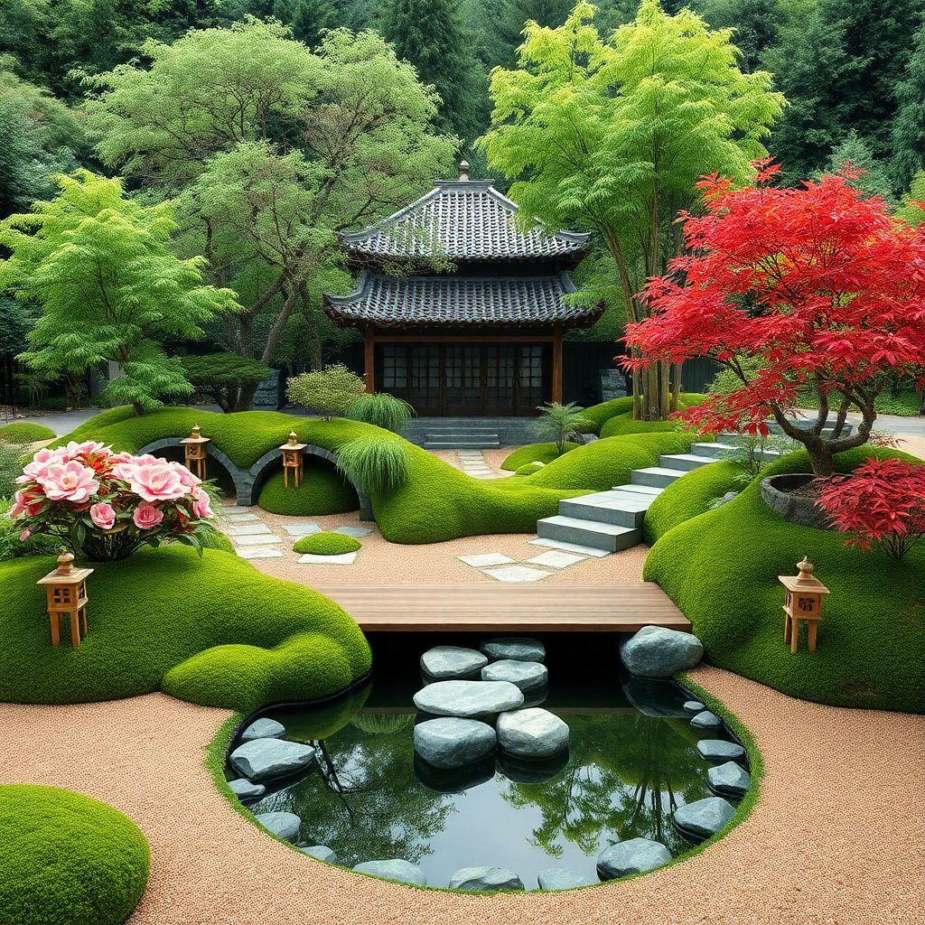 Ландшафтные идеи с чаем часто включают «сухие» ручьи, символизирующие течение времени, и каменные фонари, создающие мягкое освещение в вечерние часы.